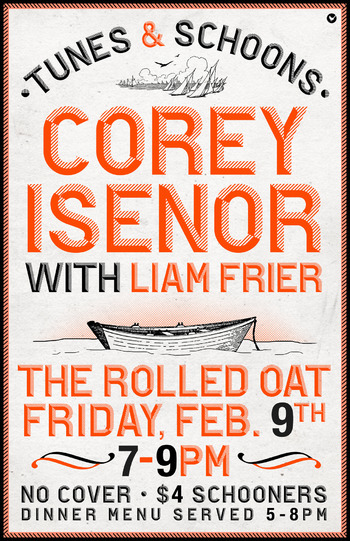 Join us at The Rolled Oat Cafe on Friday, February 9th for another evening edition of 'Tunes & Schoons' with Halifax heart-warmer Corey Isenor, and his good friend and collaborator Liam Frier.