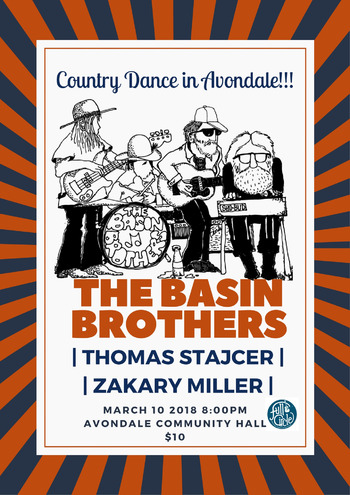 Local honky-tonkers The Basin Brothers are warming up the Avondale Community Hall with the help of Halifax Country Crooner Thomas Stajcer and Gaspereau Yodeller Zakary Miller.