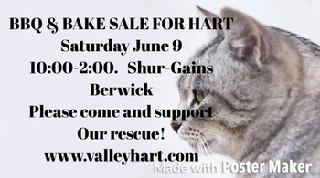 Please come out and support our rescue! BBQ'd hot dogs, veggie dogs and bake sale! FREE WILL OFFERING! All proceeds go to our cat and kitten rescue at H.A.R.T.