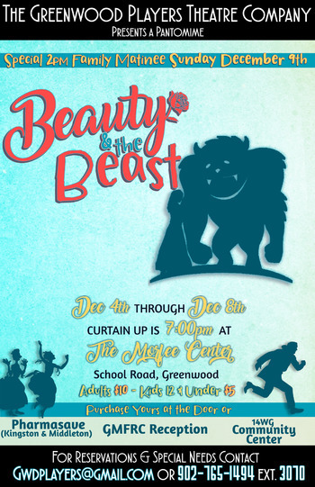 The Greenwood Players Theatre Group now in its 64th year presents a pantomime, BEAUTY and the BEAST. After refusing to marry the evil sprite ‘Belladonna’, our hero Prince is condemned to live his life as a frightening beast. Living all alone, apart from his faithful housekeeper Mrs. Hudson, he paces throughout his lonely castle, growing more bitter as the years pass by, shunning the world outside. The only way the curse on the Prince can be broken is for him, as the beast, to find true love.