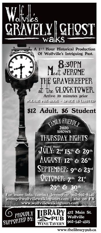 8th show of 2010. A historical production throughout the streets and cemeteries of Wolfville. A creatively spooky way to get a history lesson of a truly unique part of the world.