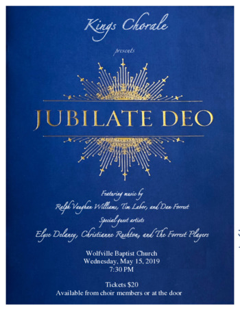 Kings Chorale presents Jubilate Deo by Dan Forrest featuring Elyse Delaney, Christianne Rushton, and the Forrest Players. The concert also features a world premier performance of "Three Places in Californina" written for Kings Choral by Annapolis Valley native Tim Labor.