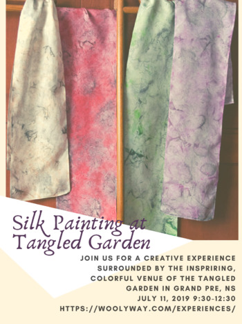 We will meet at the Tangled Garden, https://tangledgarden.ca, overlooking the Grand Pre UNESCO Heritage site and Bay of Fundy. We will begin by walking the exquisite Tangled Gardens, noting the play of colours of the various plants and how they combine in nature. Overlooking Blomidon, the fundamentals of wet on wet painting will be explained, tools used will be identified and the fundamentals of colour combinations explained. I will demonstrate the technique and you will then experiment with wet on wet on paper and fabric before creating your own one of a kind silk scarf.