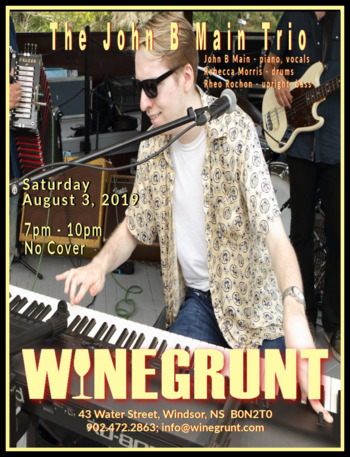 The John B Main Trio are John B Main on piano and vocals, Rebecca Morris on drums, and Rheo Rochon on upright bass, and they are bringing some smokin', jazzy blues to Winegrunt Wine Bar. No cover. Enjoy their great, bluesy music on the Natal Day weekend at "the heart of the Windsor Strip!"