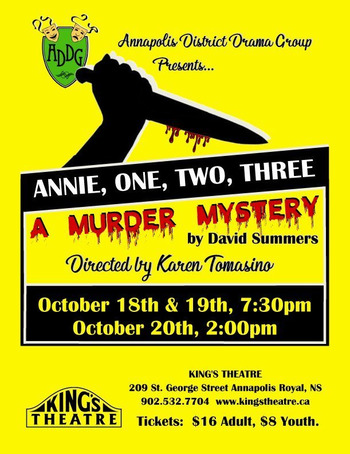A murder occurs in Annapolis Royal that is very suspicious !!! So suspicious that Detective Inspector Williams is immediately on the case. Are you curious? Join the Annapolis District Drama Group (ADDG) for ANNIE, ONE, TWO, THREE and see how Williams and Detective Constable Marsham solve the mystery. It’s full of lies, secrets, threats and MURDER.