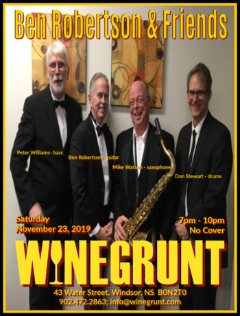 Ben Robertson and Friends play some classic jazz tunes. No cover. Ben Robertson’s guitar, Mike Watson’s sax, Peter Williams’ bass, and Don Stewart’s drums provide some smooth, beautiful tunes at “the heart of the Windsor strip” for a fun Saturday night!