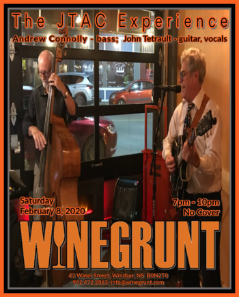 The JTAC Experience is John Tetrault on vocals and guitar, with Andrew Connolly on bass and they bring some smooth, cool, jazzy sounds to @winegrunt. No cover.