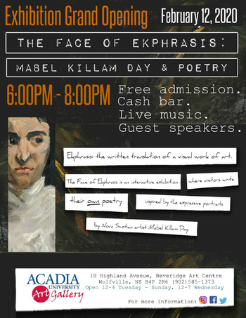 Join us at the Acadia University Art Gallery for the opening night of our new exhibition: The Face of Ekphrasis: Mabel Killam Day & Poetry. The Face of Ekphrasis is an interactive exhibition where visitors write their own poetry inspired by the expressive portraits by Nova Scotian Artist Mabel Killam Day. The evening will include a presentation by the Acadia students who curated the exhibition, guest speakers, live music, as well as food and drink available at a cash bar.