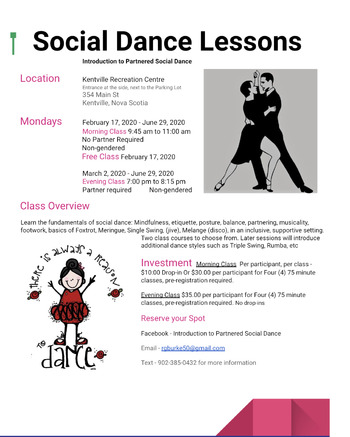 Learn the fundamentals of social dance: Mindfulness, etiquette, posture, balance, partnering, musicality, footwork, basics of Foxtrot, Meringue, Single Swing, (jive), Melange (disco), in an inclusive, supportive setting. More dance styles introduced in upcoming sessions