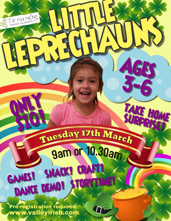 Little Leprechauns is an Irish Party filled with music, games, stories, dance and crafts that are all rooted from Ireland! A yummy snack is included and dancers in full costume will be there to entertain the kids with demonstrations throughout the event!