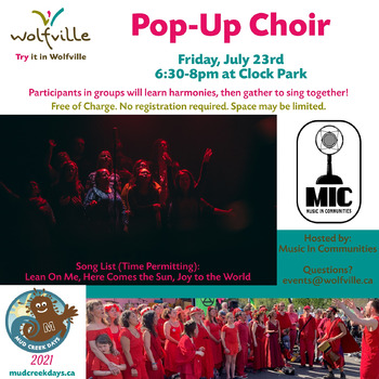 Do you like singing in harmony? Come down to Clock Park this Friday to kick off Mud Creek Days with a Pop-Up Choir! Led by Music In Communities Cooperative, participants will split into groups to learn different parts, then re-join to sign songs together. We'll be learning: "Lean on Me" (Bill Withers), "Here Comes the Sun" (The Beatles), and "Joy to the World" (Three Dog Night).