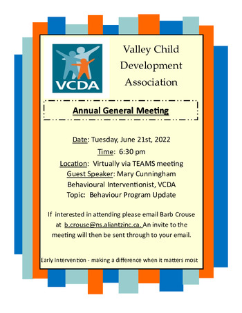 Mary Cunningham our Behavioral Interventionist at VCDA will be presenting a virtual behavior program update. If interested in attending please email Barb Crouse at [email protected]. An invite to the meeting will then be sent through to your email.