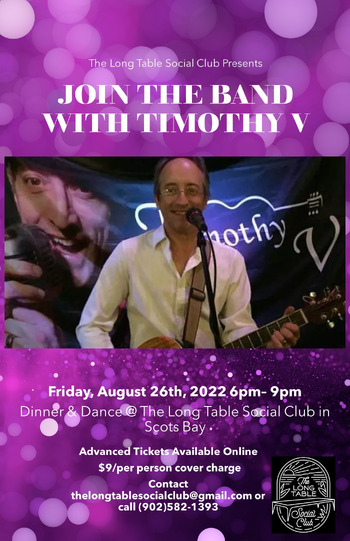 At The Long Table Social Club we love brining people together to enjoy food, drinks and music! Our intimate kitchen party style events are memorable and you leave with great memories and new friends. With Timothy V, you'll be invited to sing, dance and jam along with him - he'll even offer you instruments to play along! Enjoy dinner, entertainment and the beauty of Scots Bay on a summer evening!