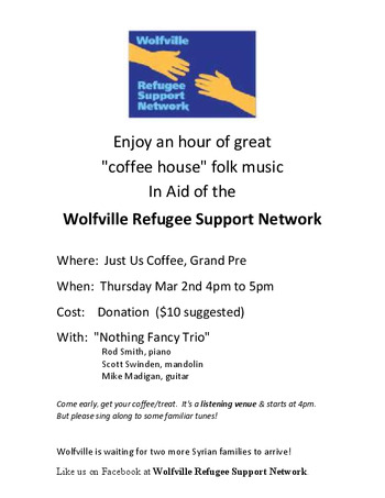 Nothing Fancy, a trio of Wolfville musicians, will perform a variety of songs that will appeal to everyone to raise funds for the Wolfville Refugee Support Network.