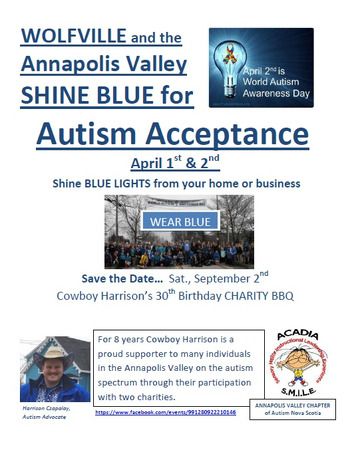 It’s Autism Advocate Cowboy Harrison. It’s that time of year again to Shine Blue for Autism Acceptance in Wolfville and the Annapolis Valley, World Autism Acceptance Day.