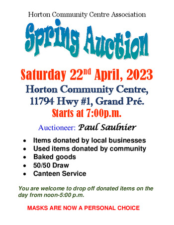 The Horton Community Centre Association presents the annual Spring Auction. The auctioneer is Paul Saulnier. Bidding on items donated from local businesses, local residents, baked goods and who knows what. There will also be a 50/50 draw, plus canteen service.