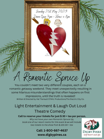 The Digby Pines stages a laugh-out-loud romantic comedy, A Romantic Spruce Up for one night only. An original play by Hal Theriault, STAHL Productions, it contemplates how and why people fall in love and the misunderstandings that often happen based on first impressions. STAHL Productions—formerly Electric City—has been producing plays for a decade.