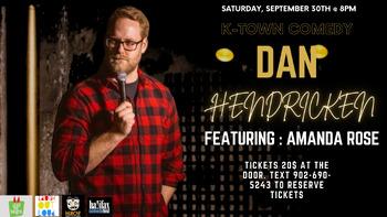K-Town Comedy Presents Dan Hendricken! Originally hailing from PEI, Dan is one of the top comics to come out of the Maritimes. He cut his teeth in comedy at the Yuk Yuk’s club in Halifax and in just a few short years was featured on CBC TV as part of the Halifax Comedy Festival. Dan has since gone on to tour all over the country as a headlining comic even performing at the flagship Yuk Yuk's in downtown Toronto. Dan has been seen on CBC TV and heard on CBC Radio (with CBC’s LOL) and has performed on the Halifax Comedy Festival and Hubcap Comedy Festival. Fans find Dan charming and hilarious. He draws in the attention of every audience he performs in front of with his charm and likeability and keeps them laughing and entertained the whole time. He recently recorded his debut album “Last Call” which is available online