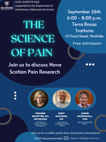 Join us to hear about the latest research about pain happening here in Nova Scotia. We will hear from invited speakers: Virginia McIntrye, Dr. Andy MacLean, and Dr. Jason McDougall.
