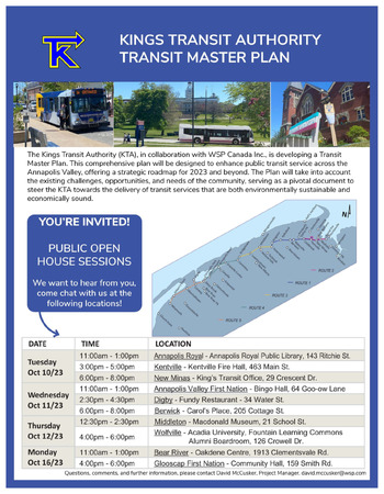Kings Transit is looking for public input to create a vision for future transit service. Drop by, view our displays, talk with our team and share your thoughts.