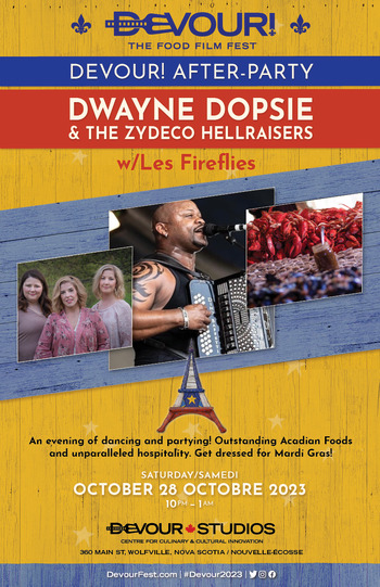 An evening of dancing and partying! This major musical event on the Audi Halifax Stage at Devour! Studios will feature Acadian musicians and Dwayne Dopsie and the Zydeco Hellraisers from Lafayette, Louisiana, outstanding Acadian Foods (a giant Acadian flag made of seafood prepared by Acadian Chefs from NS, NB and PEI), and unparalleled hospitality. Our event partner, Congrès mondial acadien, will make the announcement of Le Grand Evenement talent for their CMA 2024 headline event. Get dressed for Mardi Gras!