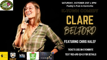 K-Town Comedy brings another packed line-up to Paddy's Pub in Kentville! The show will be headlined by the fantastic Clare Belford, and will feature Halifax favorite Chris Halef (Halifax Comedy Festival). Hosted by Hughie Batherson (Hubcap Comedy Festival, Juste Pour Rire), with some local guest spots, it's another night of stand-up that you won't want to miss!