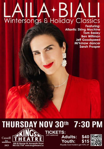 Following a triumphant global premiere of her new show Wintersongs & Holiday Classics at Toronto’s Koerner Hall in Toronto, multi-award winning vocalist, pianist, songwriter, and national radio host LAILA BIALI returns to the King’s Theatre stage with an extraordinary 9-person show, kicking off her national tour!!!