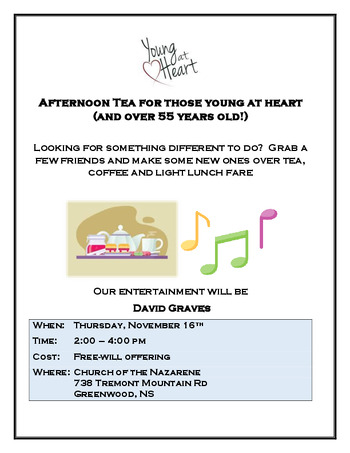 Join us for some light snacks, tea, coffee, music by David Graves, and great fellowship. For those 55 plus. Everyone is welcome!