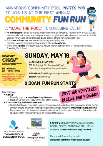 Let's get together on the May long weekend to have fun and raise some money for our pool. 3K and 5K routes available (not timed) or support us on a route of your choice. Wear a silly pool or water themed costume, if you want. Prizes for Best Costume, Most Funds Raised by a Team and by an Individual, Participant who Travelled the Furthest.