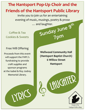 The Hantsport Pop-Up Choir and the Friends of the Hantsport Public Library (FHPL) invite you to an entertaining evening of music, musings, poetry & prose ... and laughter. Coffee & tea with cookies & sweets. Free will offering with proceeds to support the FHPL's fundraising to provide craft supplies and sponsor programs at the Isabel & Roy Jodrey Memorial Library.
