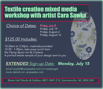 This workshop with artist Cara Sawka will have participants create a two-dimensional artwork for fabric and/or wallpaper. Post-workshop, a digitally printed sample of fabric will be sent to participants featuring their design. Materials provided and take-away lunch from the Flying Apron Inn & Cookery is included. Please book now by email, new sign-up date is Monday, July 15th.