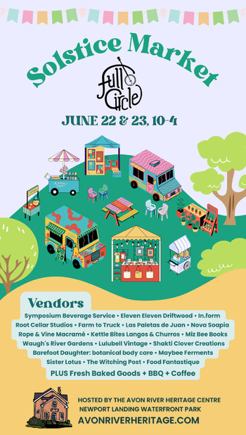 Taking place throughout the Newport Landing Waterfront Park, the Solstice Market is part of the Full Circle Festival. The 2024 Solstice Market will showcase a variety of local crafters, herbalists, small businesses and food vendors, with a BBQ fundraiser in support of the museum and shipyard. Parking is limited so wear your best walking shoes and make a day of it exploring local trails and the winery. Limited tickets for Friday & Sunday performance are still available at fullcirclefestival.ca/tickets