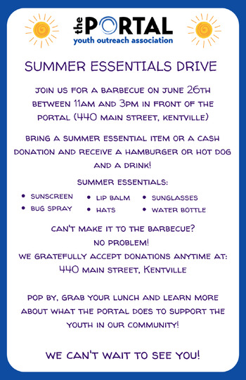 Join us for a barbecue to support local youth at our Summer Essentials Drive! Bring a donation of summer essentials (sunscreen, bug spray, hats, lip balm, sunglasses, reusable water bottles) or a cash contribution and enjoy a delicious hamburger or hot dog and a refreshing drink—on us!