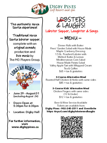 An authentic Nova Scotia experience! Indulge in a traditional, 3-course lobster supper complete with original theatre production created for Digby Pines and live musical entertainment in the casual, family-style atmosphere of Digby Hall. The feature of the evening is a 1.5 lb cooked lobster served with salads, corn-on-the-cob, rolls and dessert. Alternative meal and kids’ menu available. Tickets are required.