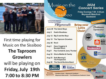 The Taproom Growlers are an exciting acapella Sea Shanty singing group out of Annapolis Royal. The Weymouth folks have a great riverside venue there, and we're looking forward to growling in the evening air.
