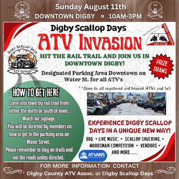 Join us for the ultimate invasion! The Digby Scallop Days ATV Invasion is returning this year, and it's going to be bigger and better than ever! Last year, we braved the pouring rain with nearly 100 machines, but this year, we're expecting that number to quadruple. Buckle up and join us for this one of a kind event on Digby's waterfront.