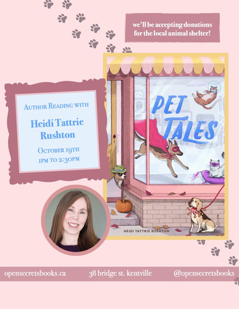 Join local author Heidi Tattrie Rushton for a reading and signing of her middle-grade novel, Pet Tales! Set in October in Kentville, the story follows eleven-year-old Penny, who struggles with anxiety and finds solace writing about the pets at the local animal shelter where she volunteers. When she learns the shelter is in danger of closing, Penny discovers she might have the power to help save it. This heartwarming tale explores themes of friendship, courage, and the healing bond between kids and animals.
