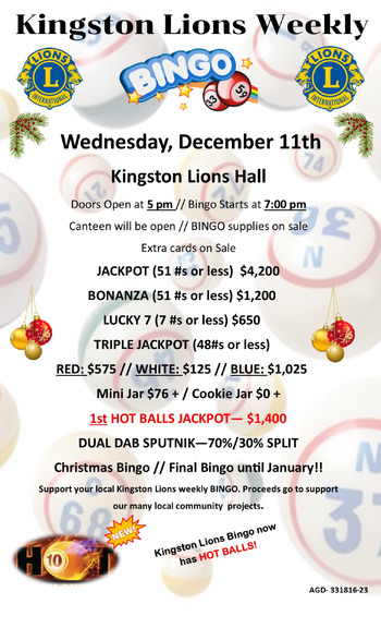 Card prices vary with games being played. Canteen on site, Bingo supplies available for purchase. 50/50 tickets available. We now have HOT BALLS!!